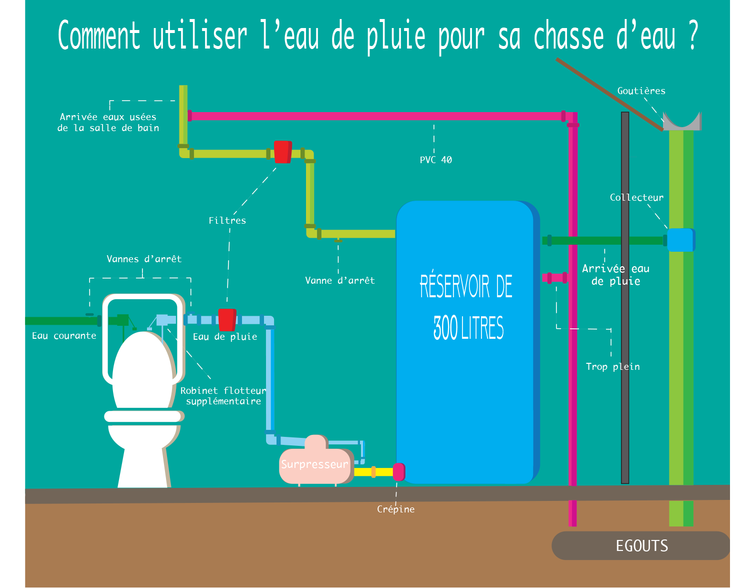 Parce que faire ses besoins dans l’ eau potable n est plus admissible à  l’heure actuelle.                                                                                                                                       Parce que l’avenir de tout ce qui vit dépend de notre capacité à gérer cette ressource vitale, nous devons proposer des alternatives aux dispositifs classiques actuels qui sont aberrants et littéralement contre Nature.                                                            Pourquoi ne pas commencer par un eco quartier équipé de ces dispositifs, avant plus tard, de l imposer dans le P.L.U pour les constructions neuves.                                              Je refuse d’avoir à rougir face aux générations futures qui regarderont ces pratiques en mode, vous étiez sérieux là ?               Bon sang même les romains avaient des canalisations séparées qui reliaient les eaux de pluie aux latrines et nous on n ’y arriverait pas !?!                                          C est insensé et nous allons tous le payer très cher si nous ne prenons pas les mesures pour y remédier.                                     D’ailleurs c est peut être pour ça que personne ne s’en soucie au niveau communal, pensez donc, remplacer une eau lavée,  traitée, assainie, potable et surtout surfacturée, que tout le monde gâche allègrement, par une ressource récupérée qui n’engendre de profits pour personne !!!                                                                                                      Alors SVP jetez un œil à ce schéma simple mais assez parlant et vous verrez qu en plus c est pas si compliqué à realiser.                         Le problème c est que ça ne serait plus lucratif  n est-ce pas …                                                                                               Il faut agir,  prenons maintenant des décisions pour le futur !                                         Jarny pourrait être pionnière dans l’optimisation de la ressource en eau appliquée à  l’habitat et ainsi renforcer son attractivité.                                                                              J espère qu un jour, le plus tôt possible, ce geste inconsidéré de gâcher autant d’eau potable fera définitivement partie du passé.                                                                       Pensez-y,  à chaque fois.    Quelle absurdité.